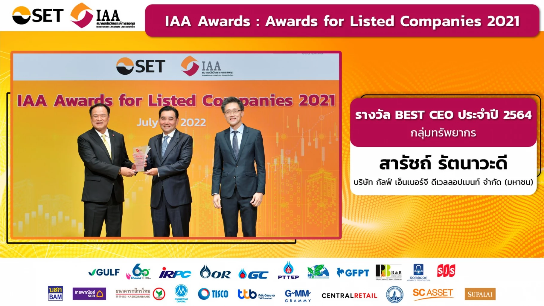 นายสารัชถ์ รัตนาวะดี ประธานเจ้าหน้าที่บริหาร บริษัท กัลฟ์ เอ็นเนอร์จี ดีเวลลอปเมนท์ จำกัด (มหาชน) หรือ GULF นำโดย รับรางวัล Best CEO กลุ่มทรัพยากร จากงาน IAA Awards for Listed Companies 2021 จัดขึ้นโดยสมาคมนักวิเคราะห์การลงทุน (IAA) โดยได้รับเกียรติจากนายอนุทิน ชาญวีรกูล รองนายกรัฐมนตรีและรัฐมนตรีว่าการกระทรวงสาธารณสุข เป็นประธานในพิธีมอบรางวัล ณ ตลาดหลักทรัพย์แห่งประเทศไทย