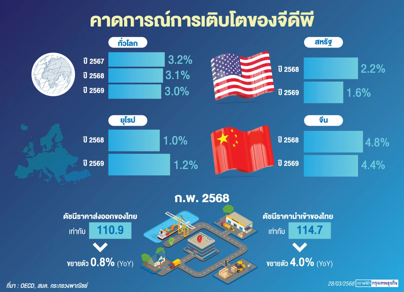คาดว่าการเติบโตของจีดีพีประจำปีของสหรัฐ จะชะลอตัวลงจากอัตราการขยายตัวที่แข็งแกร่งในช่วงที่ผ่านมา โดยอยู่ที่ 2.2% ในปี 2568 และ 1.6% ในปี 2569ส่วนฝั่งยุโรปอยู่ที่ 1.0% ในปี 2568 และ 1.2% ในปี 2569 ขณะที่จีนจะชะลอตัวลงจาก 4.8% ในปีนี้เหลือ 4.4% ในปี 2569