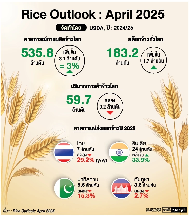 อย่างไรก็ตาม ในส่วนรายงานRice Outlook: May 2025 ที่ออกมาคาดการณ์การผลิตข้าวทั่วโลกในปี 2025/26 คาดว่าจะสูงเป็นประวัติการณ์โดยอินเดียคาดว่าจะเก็บเกี่ยวข้าวได้เป็นประวัติการณ์เป็นครั้งที่ 10 ติดต่อกัน ส่งผลให้อุปทานข้าวทั่วโลกในปี 2025/26 คาดว่าจะอยู่ที่ 723.8 ล้านตัน เพิ่มขึ้น 6.1ล้านตันจากปีก่อน และเพิ่มขึ้นเป็นปีที่สามติดต่อกัน