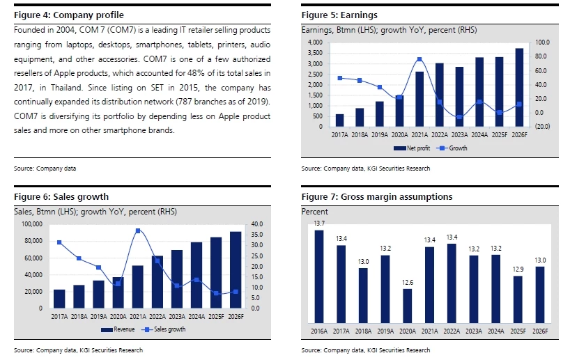 สำรองสำหรับสินค้าตกรุ่น และ iii) การแข่งขันที่เข้มข้นมากขึ้นอาจจะทำให้ต้องจัดแคมเปญการตลาดเราปรับเพิ่มประมาณการกำไรสุทธิปี 2568-2569 ขึ้นอีก 8-10% เพื่อสะท้อนถึงผลประกอบการจริงในปี 2567 เรายังคงคาดว่ายอดขายของ COM7 จะโตระดับหลักเดียวสูง ๆ ในปี 2568-2569 แต่คาดว่าอัตรากำไรขั้นต้นจะเพิ่มขึ้น 10bps ในปี 2568-2569 ซึ่งสะท้อนถึง product mix ที่ดีขึ้นเป็น 12.9% ในปี 2568 และ 13.0% ในปี 2569 (จาก 13.2% ในปี 2567)