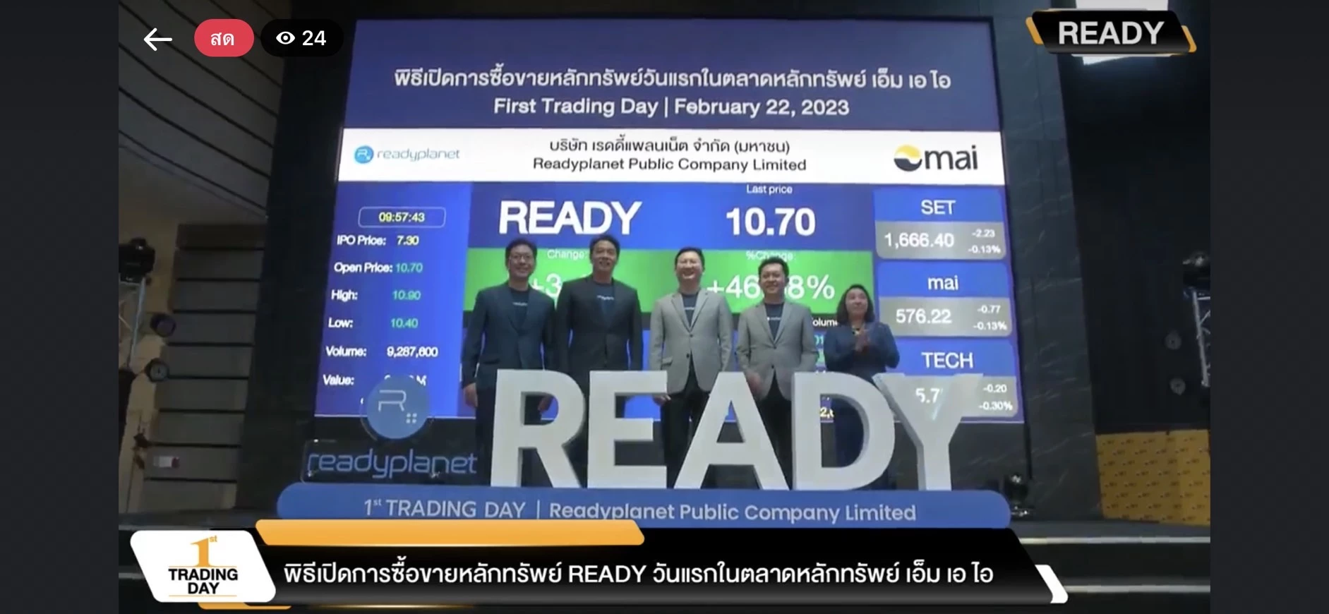 บมจ.เรดดี้แพลนเน็ต จำกัด (มหาชน) (READY) เข้าซื้อขายหุ้น (เทรด) วันแรกในตลาดหลักทรัพย์ เอ็ม เอ ไอ (MAI) วันนี้ (22 ก.พ.66) โดยมีราคาเปิดที่ 10.70 บาท เพิ่มขึ้น 3.40 บาท หรือ 46.58% จากราคา IPO ที่ 7.30 บาทต่อหุ้น