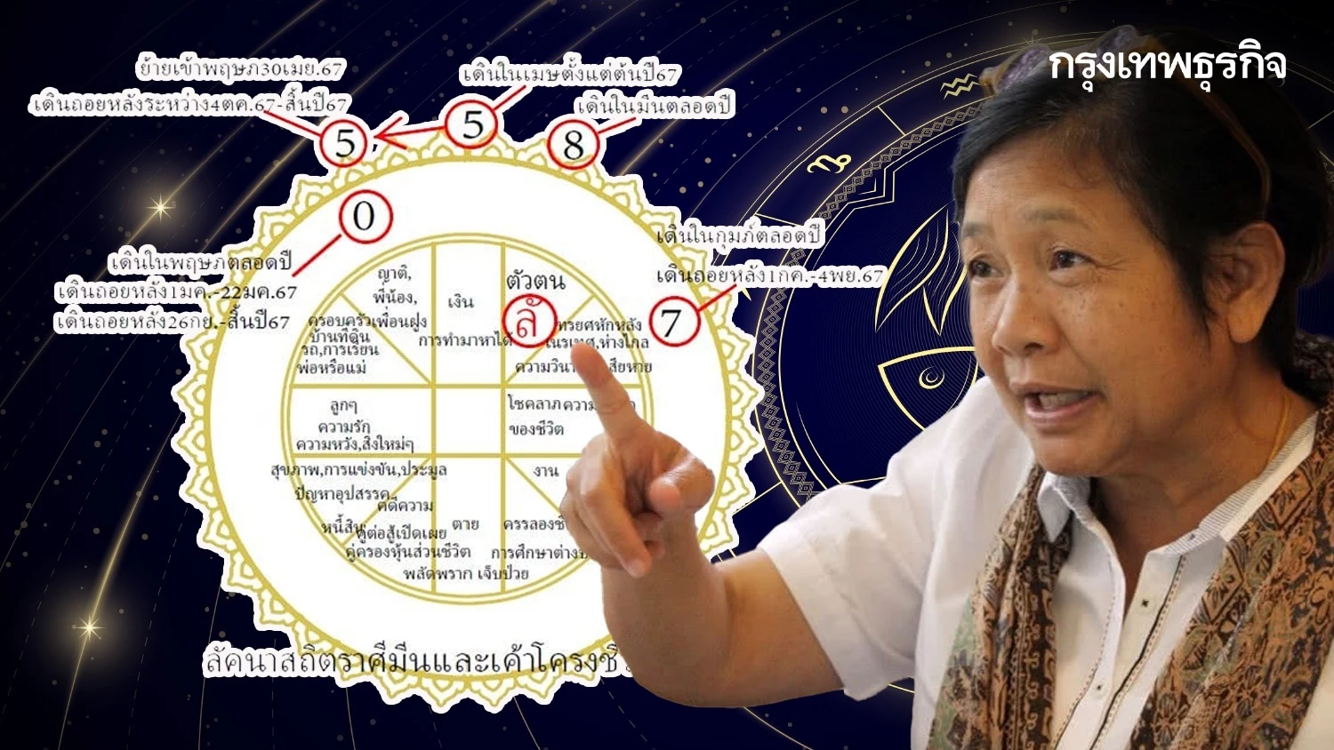 1.3 ตั้งแต่ต้นปี - 30 เมษายน 2567 ปรากฎการณ์ต่อเนื่องจากประมาณกลางเมษายน 2566 คือ มีศัตรูก็จะมาคืนดีหรือเจรจายอมความตามโฉลก ศัตรูมีมาคืนดีโอนอ่อนเอง (พฤหัสบดีจร5 เดินในราศีเมษ-ภพที่สอง-กะฎุมภะ) เช่น จู่ๆ ลูกหนี้ที่มีคดีกันเอาเงินมาคืน เป็นต้น