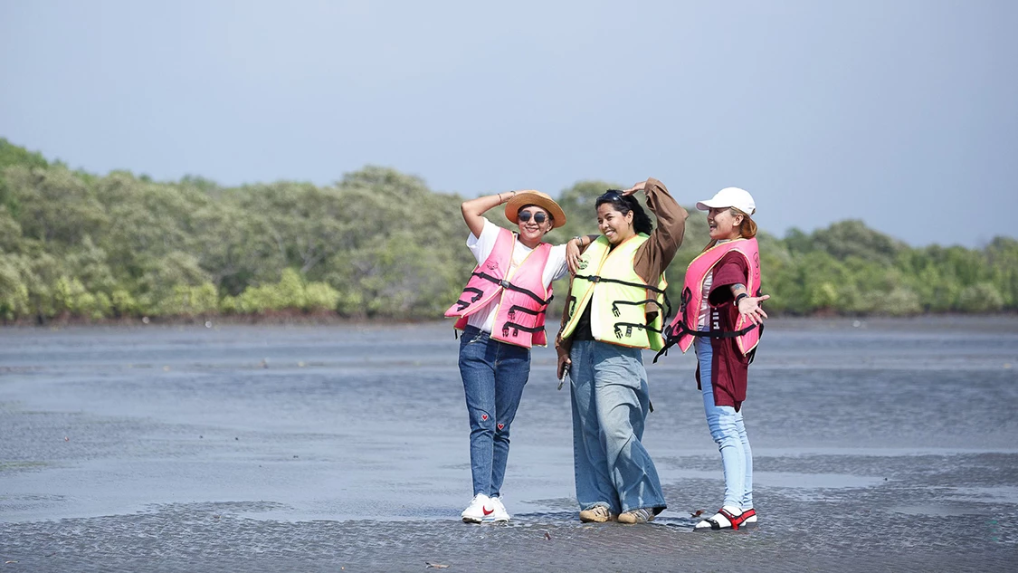 เมื่อล่องเรือไปอีกสักพัก จนเห็นเนินทรายสีเข้มที่ปรากฎขึ้นในช่วงน้ำลด มันเป็นดินทรายปนโคลนแบบป่าชายเลน แต่แสงที่แผดจ้าอาจทำให้ทุกอย่างดูขาวโพลนไปหมด จนเรือเข้าไปเทียบแนวสันทราย จึงได้รู้ว่ามันมีสีสันมากกว่าที่ตาเห็น