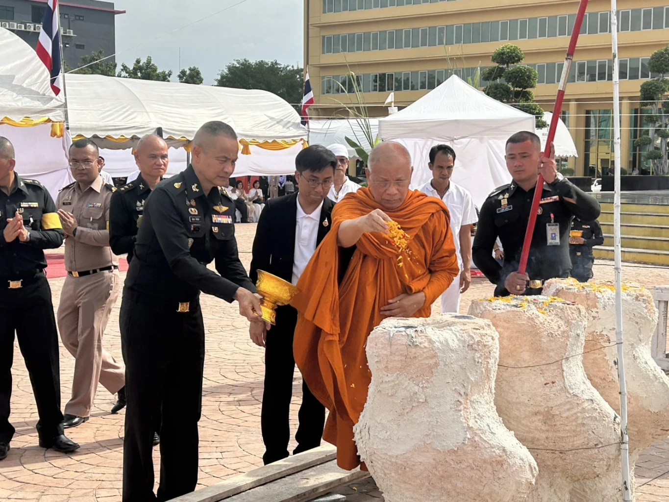 นอกจากนี้ยังได้รับความกรุณาจากพระสงฆ์นั่งปรกอธิษฐาน จิต 4 รูป ประกอบด้วย พระราชสิริวัชรรังษี เจ้าอาวาสวัดชินวราราม วรวิหาร จังหวัดปทุมธานี พระครูภัทรกิจวิมล เจ้าอาวาสวัดโพธิ์เผือก จังหวัดอยุธยา พระครูสุวรรณโชติวุฒิ เจ้าอาวาสวัดหูช้าง จังหวัดนนทบุรี หลวงพ่อ สารันต์ จันทูปโม เจ้าอาวาสวัดดงน้อย จังหวัดลพบุรี พร้อมด้วย รองปลัดกระทรวงกลาโหม ผู้แทนผู้บัญชาการทหารสูงสุด ผู้แทน ผู้บัญชาการเหล่าทัพ นายทหารชั้นผู้ใหญ่ในสังกัดสำนักงานปลัดกระทรวงกลาโหม ตลอดจนกำลังพล และพี่น้องประชาชนผู้มีจิตศรัทธา ร่วมในพิธีโดยพร้อมเพรียงกัน