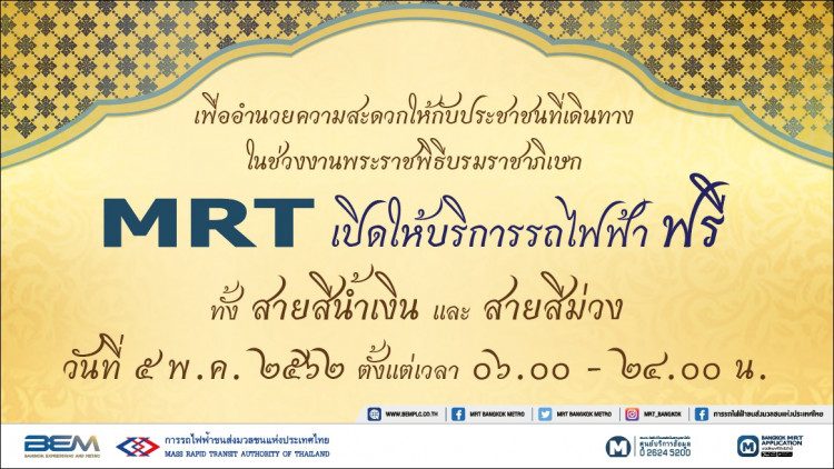 รฟม. เปิดให้บริการรถไฟฟ้าและที่จอดรถฟรี เพื่ออำนวยความสะดวกและรองรับการเดินทางของประชาชน ช่วงงานพระราชพิธีบรมราชาภิเษก 4-6 พ.ค.นี้