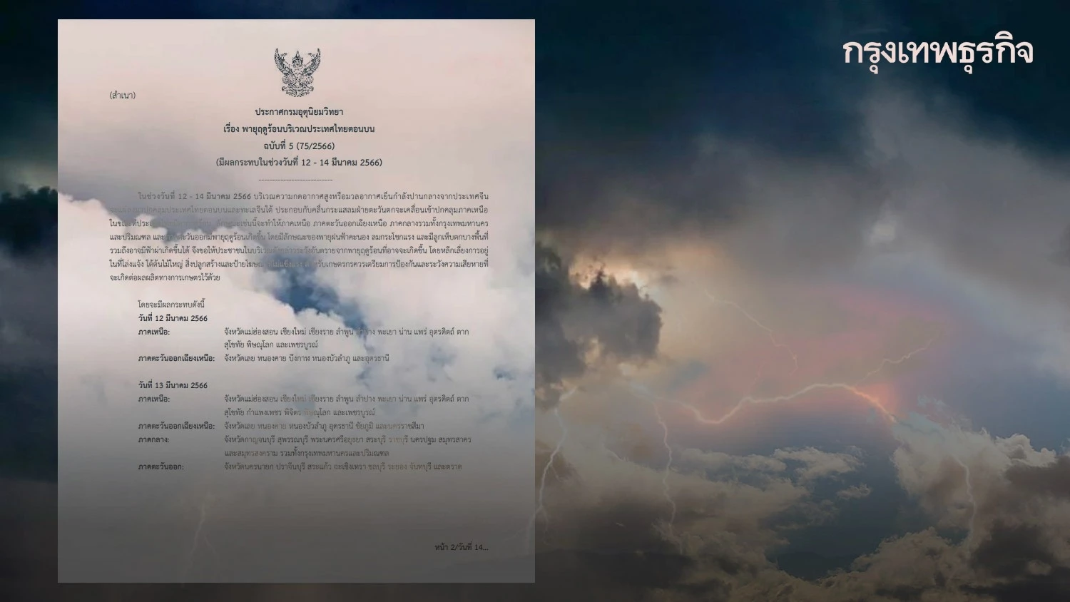 ประกาศ กรมอุตุนิยมวิทยา ฉบับที่ 5 "พายุฤดูร้อน" บริเวณประเทศไทยตอนบน มีผลกระทบในช่วงวันที่ 12 - 14 มีนาคม 2566 หลายจังหวัดเตรียมรับมือพายุฝนฟ้าคะนอง ลมแรง ลูกเห็บตก และฟ้าผ่า