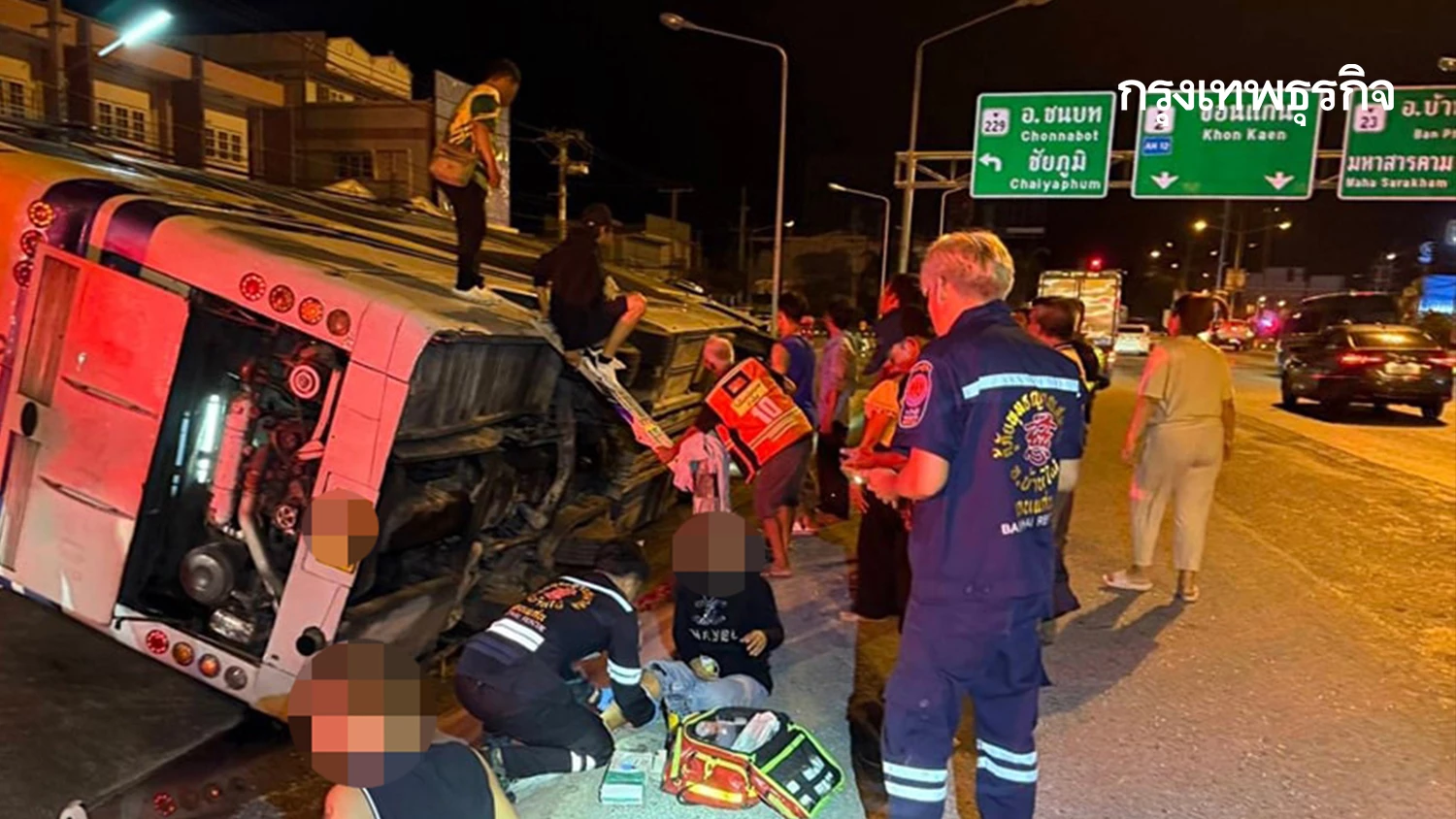 รถโดยสารปรับอากาศเสียหลักพุ่งลงร่องกลางถนน ผู้โดยสารบาดเจ็บเล็กน้อย 36 คน กู้ภัยเข้าช่วยเหลือนำผู้บาดเจ็บส่งโรงพยาบาลบ้านไผ่เป็นการเร่งด่วน โดยสาเหตุเบื้องต้นคาดว่าคนขับหลับใน