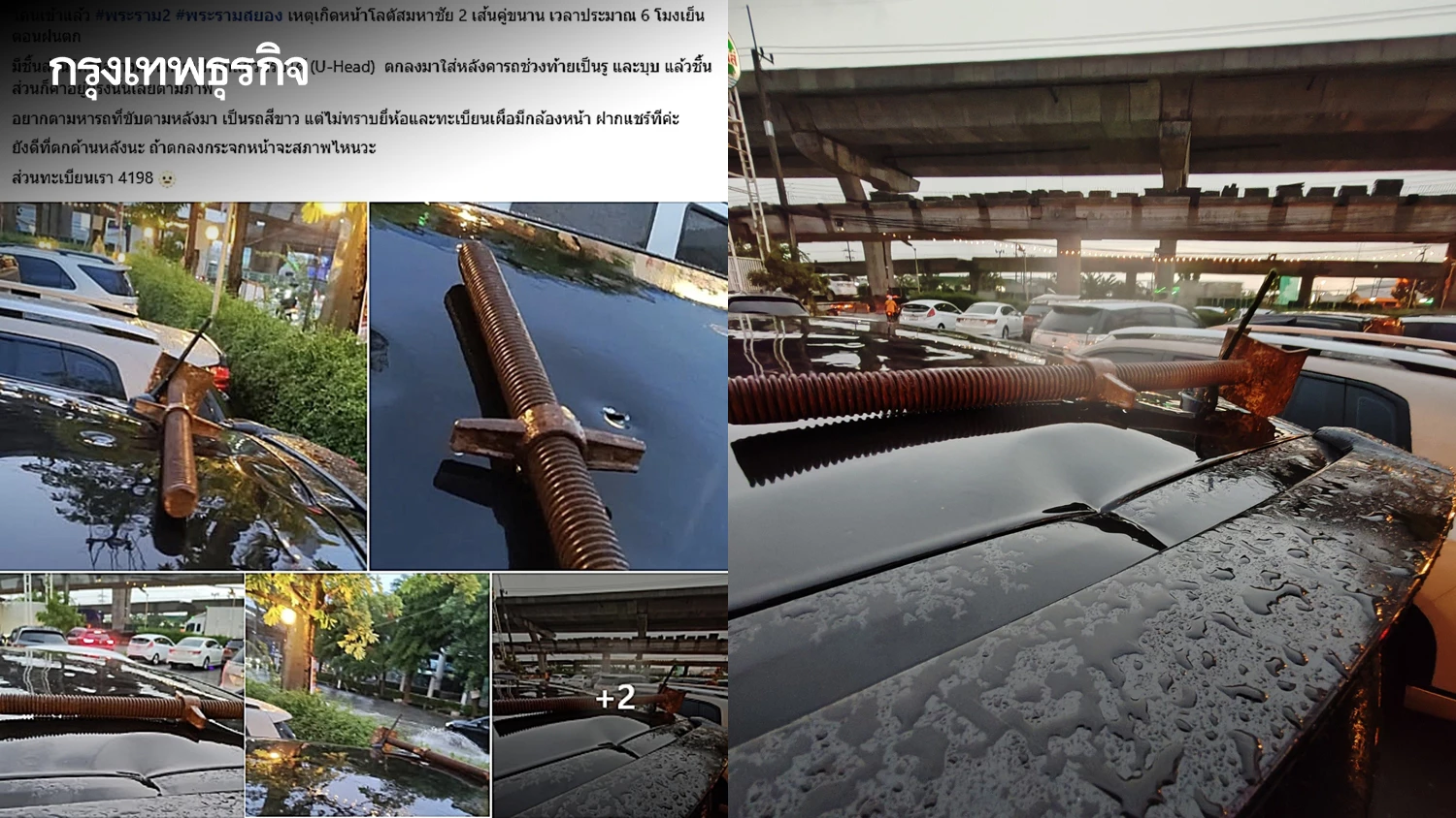 โดยผู้โพสต์ระบุข้อความว่า 'โดนเข้าแล้ว #พระราม2 #พระรามสยอง เหตุเกิดหน้าโลตัสมหาชัย 2 เส้นคู่ขนาน เวลาประมาณ 6 โมงเย็น ตอนฝนตก มีชิ้นส่วนโครงสร้างคอนกรีตเป็นเกลียวปรับได้ (U-Head) ตกลงมาใส่หลังคารถช่วงท้ายเป็นรู และบุบ แล้วชิ้นส่วนก็คาอยู่ตรงนั้นเลยตามภาพ อยากตามหารถที่ขับตามหลังมา เป็นรถสีขาว แต่ไม่ทราบยี่ห้อและทะเบียน เผื่อมีกล้องหน้า ฝากแชร์ทีค่ะ ยังดีที่ตกด้านหลังนะ ถ้าตกลงกระจกหน้าจะสภาพไหน ส่วนทะเบียนเรา 4198'