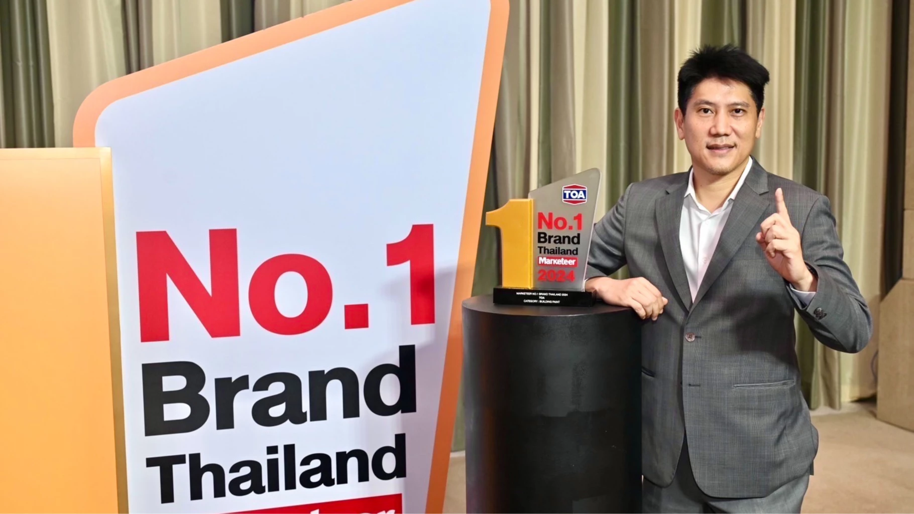 นายจตุภัทร์ ตั้งคารวคุณ ประธานเจ้าหน้าที่บริหาร บริษัท ทีโอเอ เพ้นท์ (ประเทศไทย) จำกัด (มหาชน) หรือ TOA รับรางวัลสุดยอดแบรนด์สียอดนิยมอันดับ 1 ของไทย (No.1 Brand Thailand 2024) จากผลสำรวจคนไทยทั้งประเทศ ในกลุ่มสีทาอาคารติดต่อกันเป็นปีที่ 12 การันตีว่าผู้บริโภคให้ความเชื่อมั่น ไว้วางใจ และเลือกใช้มากที่สุด จัดขึ้นโดย Marketeer Group ร่วมกับ บริษัท มาร์เก็ตติ้งมูฟ จำกัด เพื่อสำรวจความพึงพอใจของผู้บริโภคกว่า 6,000 กลุ่มตัวอย่างที่ครอบคลุมทุกภูมิภาคของประเทศ เพื่อมุ่งสร้างมาตรฐานใหม่ให้นักการตลาดและแบรนด์อย่างต่อเนื่อง โดยมี นายเพิ่มพล โพธิ์เพิ่มเหม บรรณาธิการและผู้ก่อตั้ง Marketeer ร่วมแสดงความยินดี ณ โรงแรมสยามเคมปินสกี้ กรุงเทพฯ