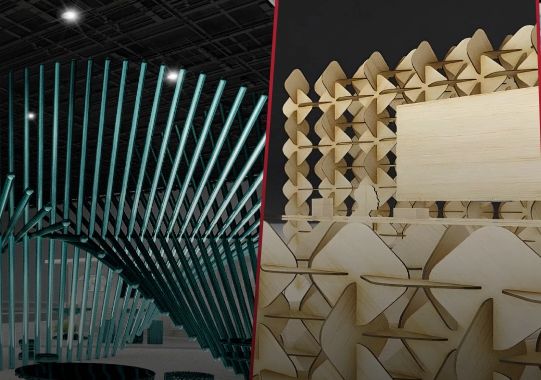 และ 4. EMPOWER STEEL x ACa Architects - ผลงานการถอดรหัสเหล็กที่แข็งแรงสู่โมเลกุลในยูนิตที่เล็กลงทรงเรขาคณิต สื่อถึงความเป็นธาตุโลหะซึ่งเป็นส่วนหนึ่งของธรรมชาติที่มีความพลิ้วไหว สร้างจินตนาการใหม่ๆ โดยใช้เหล็กจาก EMPOWER STEEL ที่มีนวัตกรรมทำสีและพิมพ์ลวดลายมาตัดเป็นชิ้นนับหมื่นแผ่น บากร่องเพื่อต่อขึ้นเป็นโครงสร้าง (Modular Structure) โชว์พื้นผิว สี ฉีกกฎเหล็กจากอุตสาหกรรมทั่วไป สู่งานดีไซน์ที่หลากหลายตามจินตนาการ