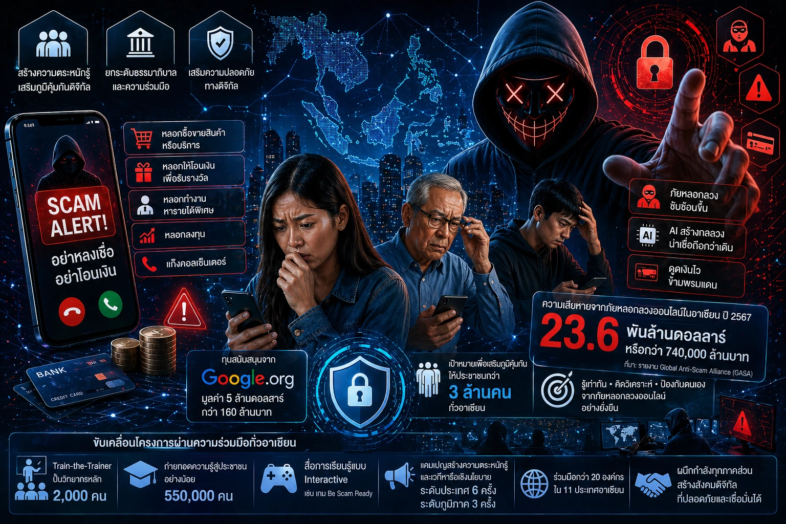 ด้วยทุนสนับสนุนจาก Google.org มูลค่า 5 ล้านดอลลาร์ หรือกว่า 160 ล้านบาท โครงการ Scam Ready ASEAN ถือเป็นหนึ่งในโครงการป้องกันภัยดิจิทัลที่ใหญ่ที่สุดในภูมิภาค มีเป้าหมายเพื่อเสริมสร้างภูมิคุ้มกันด้านการรู้เท่าทันภัยหลอกลวงให้กับประชาชนกว่า 3 ล้านคนทั่วอาเซียน ผ่านการเสริมสร้างความรู้ ความมั่นใจในการใช้เทคโนโลยีดิจิทัล และทักษะการคิดวิเคราะห์ให้ประชาชนสังเกตและป้องกันตัวจากภัยหลอกลวงในโลกออนไลน์ที่ซับซ้อนขึ้นเรื่อยๆ