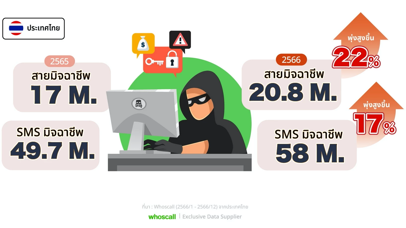 ขณะที่เทรนด์หลอกลวงในเอเชียดูเหมือนจะคลี่คลายลง ปี 2566 คนไทยกลับเสี่ยงโดนหลอกจากสายโทรเข้าและข้อความ รวม 79 ล้านครั้ง เพิ่มขึ้น 18% จากยอดรวม 66.7 ล้านครั้ง ในปี 2565 จำนวนสายโทรเข้า 20.8 ล้านครั้ง เพิ่มขึ้น 22% จาก 17 ล้านครั้ง ในปี 2565 และข้อความหลอกลวงเพิ่มขึ้น 17% สูงถึง 58.3 ล้านข้อความ จาก 49.7 ล้านข้อความ ในปี 2565